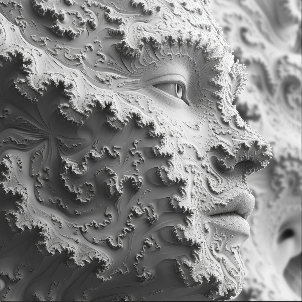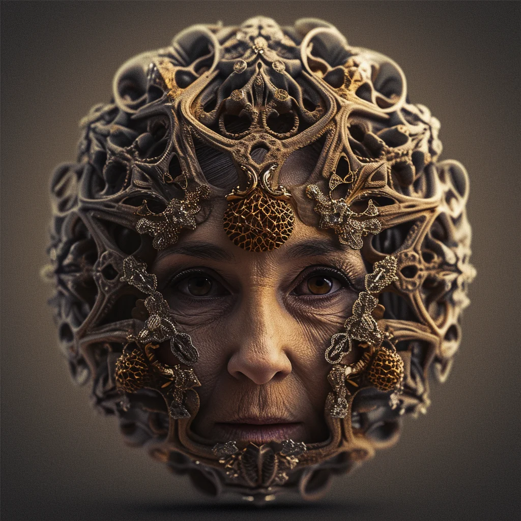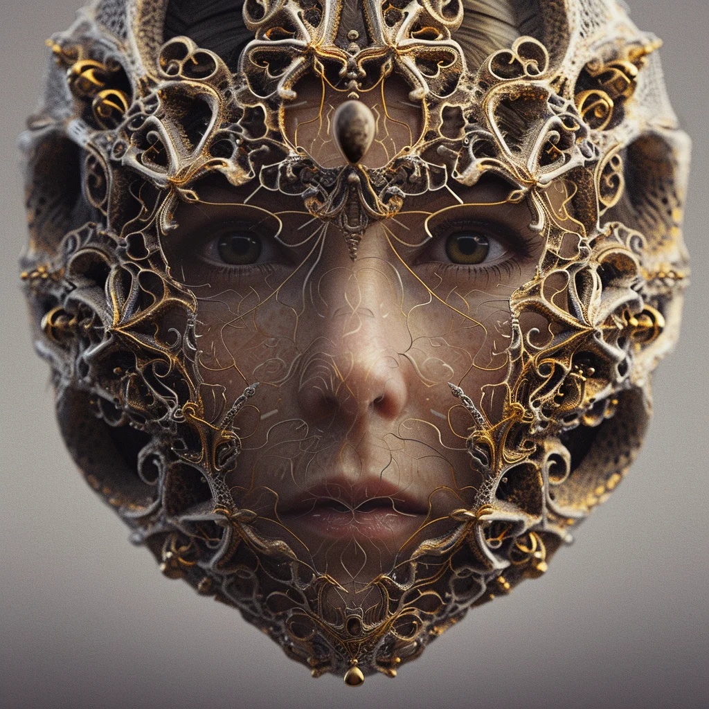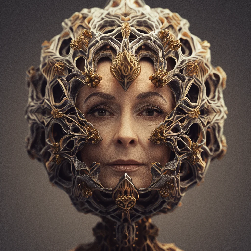 Human faces emerge from fractal lattices, their features woven into mathematical infinities. Gold filigree blooms with the precision of code and the elegance of baroque jewelry. This collection explores the boundary where computation becomes decoration, where Mandelbrot meets portraiture, and where the cold logic of algorithms produces warm, intricate beauty.