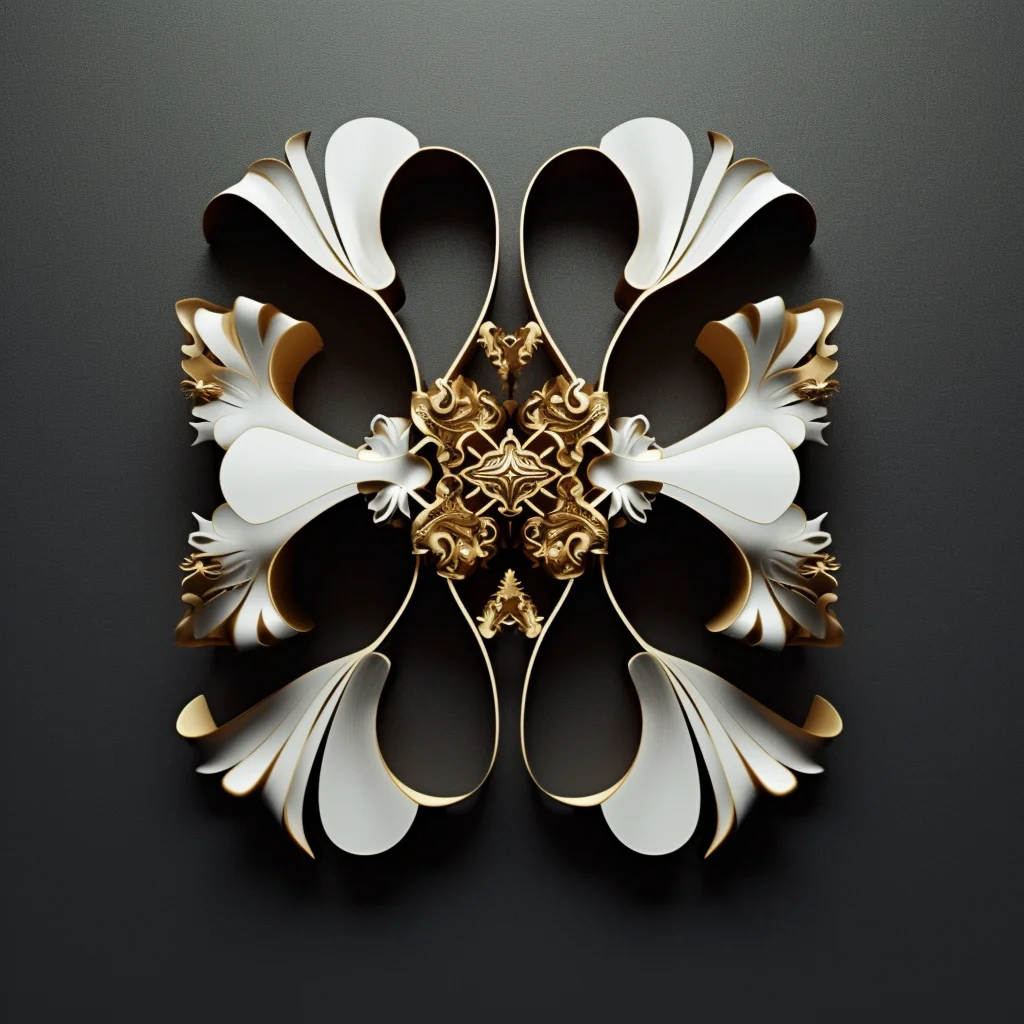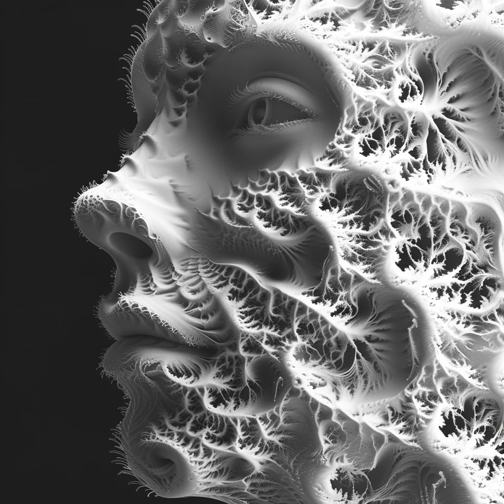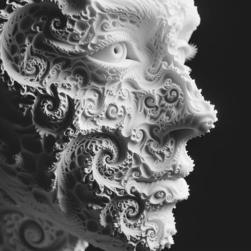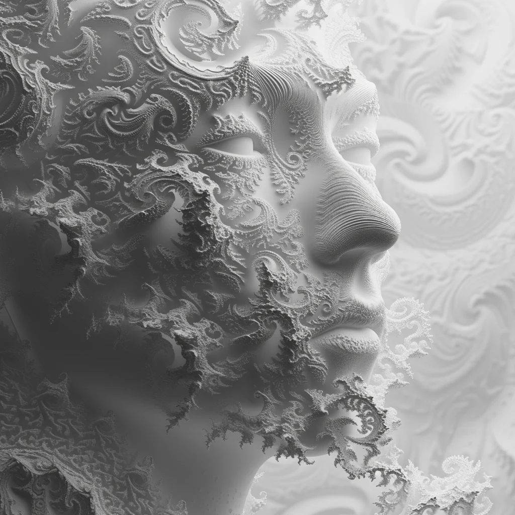 Human faces emerge from fractal lattices, their features woven into mathematical infinities. Gold filigree blooms with the precision of code and the elegance of baroque jewelry. This collection explores the boundary where computation becomes decoration, where Mandelbrot meets portraiture, and where the cold logic of algorithms produces warm, intricate beauty.