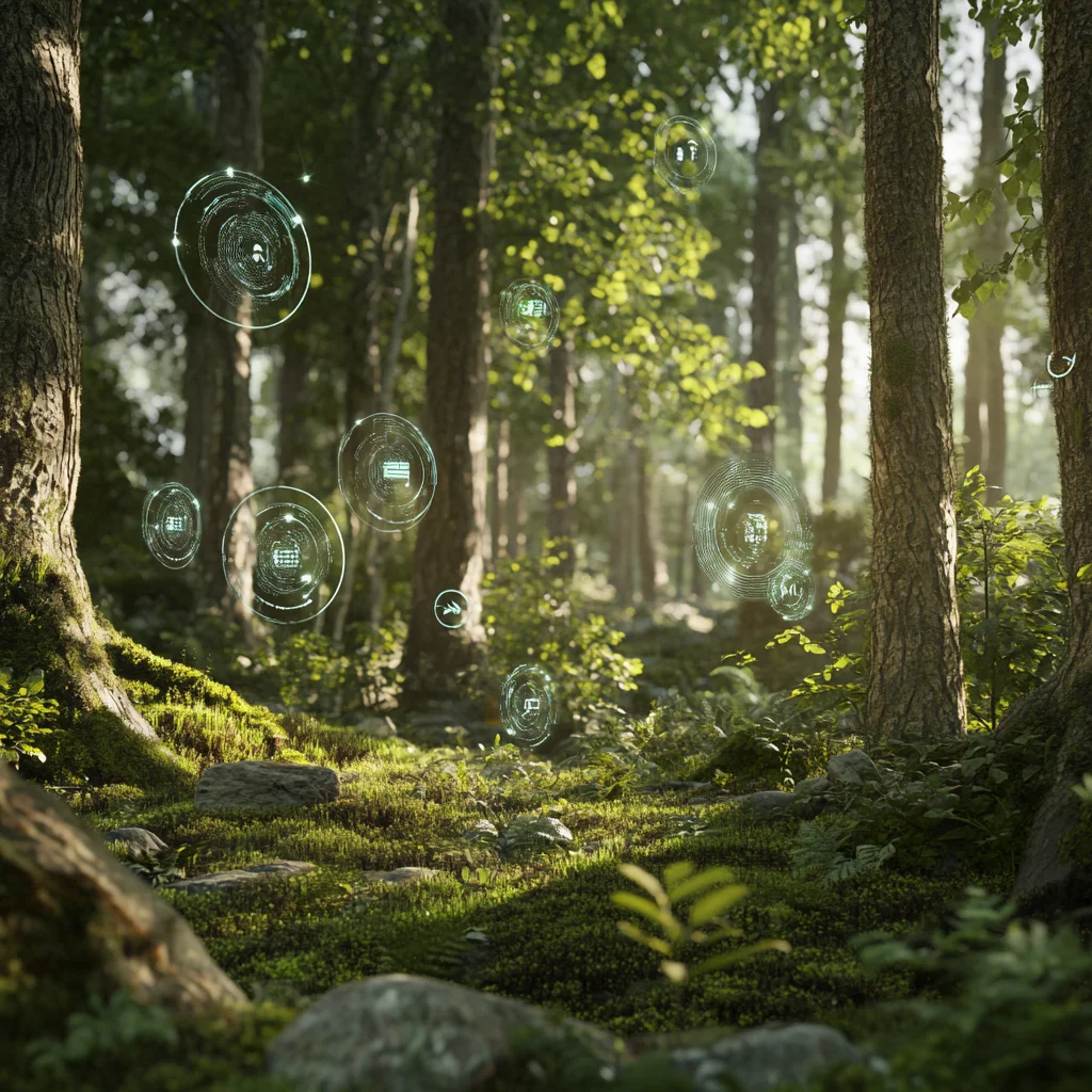 Holographic interfaces bloom among ancient trees. Digital waypoints hover above moss-covered stones. Nature and technology achieve unexpected harmony in these liminal spaces where the boundary between physical and virtual dissolves into dappled light.